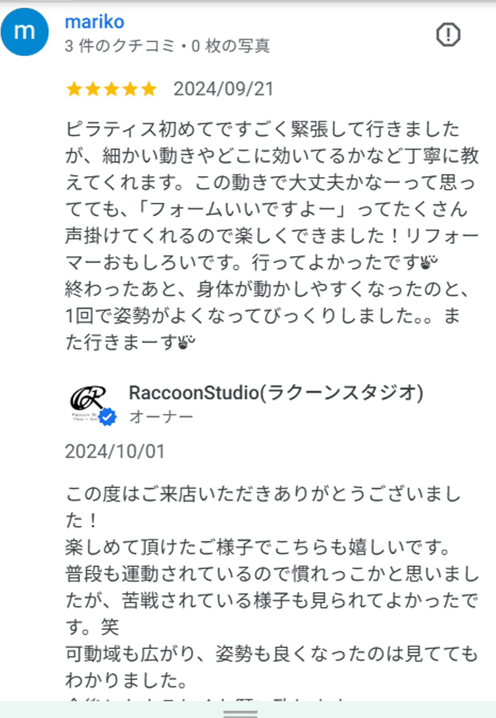 ピラティス初めてですごく緊張して行きましたが、細かい動きやどこに効いてるかなど丁寧に教えてくれます。 2025 12/04 お客様の声 2025年12月4日 2025年12月4日 お客様の声 よかったらシェアしてね! URLをコピーしました! URLをコピーしました! リフォーマーがなかなか楽しいです。 運動嫌いですが、初回体験で体の変化に驚きこれなら楽しく続けられそうと思って通っています。 この記事を書いた人 uekiryota 関連記事 パーソナルでそれなりに課金も必要ですが見返りの多い時間ですので続けようと思います 2025年12月10日 ピラティスのおかげで長年の悩みだったO脚が少しずつよくなってきています。 2025年12月9日 トレーナーの方がとにかくお綺麗で目標にもなります! 2025年12月9日 月に2キロ減量(3か月で6キロ減量)できました。 2025年12月9日 ①周りからすっきりしたと言われる②疲れやすさも解消③体がほぐされることで血の巡りが改善されているのか肌のコンディションも良いです。 2025年12月4日 トレーナーの方が素敵で最高です 2025年12月4日 猫背でお腹もでてきているので姿勢改善をしたいと思い通いはじめました。 2025年12月4日 反り腰や姿勢の歪みが気になっていましたが、今ではかなり改善してきました。 2025年12月4日 コメント コメントする コメントをキャンセルコメント ※ 名前 ※ メール ※ サイト 次回のコメントで使用するためブラウザーに自分の名前、メールアドレス、サイトを保存する。
